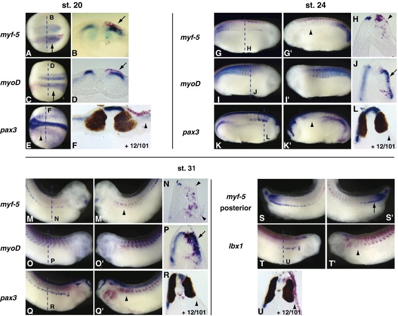 Fig. 3. Shh over-expression promotes initial epaxial muscle differentiation but inhibits markers of epaxial myotome expansion and hypaxial body wall myoblasts. Shh mRNA was injected into one cell at the 2-cell stage. Embryos are pictured as dorsal views with anterior to the left and the injected side down (A, C, E), transverse sections with the injected side on the right (B, D, F, H, J, L, N, P, R, U), or lateral views with the uninjected side facing right and injected side facing left (all other panels). Dashed lines indicate the approximate positions of the transverse sections. Red staining represents lineage tracing of co-injected beta-galactosidase mRNA. At stage 20, there is an increase of myf-5 (A, B, arrows, A shown from a posterior vantage point) and myoD (C, D, arrows) and a decrease of pax3 (E, F, arrowheads) expression on the injected side of the embryo. At stages 24 and 31, an increase of myoD expression on the injected side is still observed (IâJ, OâP, arrows). The expression of myf-5 in the expanding dorsal and ventral region of the myotome is lost on the injected side (GâH, MâN, arrowheads), but expression in posterior somites where initial myogenesis is occurring is normal (S, Sâ², arrow). pax3 and lbx1 expression are also lost on the injected side (KâL, QâR, TâU, arrowheads). Transverse sections of pax3 and lbx1 expression are co-labeled with the 12/101 antibody. At stage 20, there is no significant difference in differentiated muscle on the injected side of the embryo (F). At stages 24 and 31, a wider, shorter amount of differentiated muscle is observed on the injected side (L, R, U).