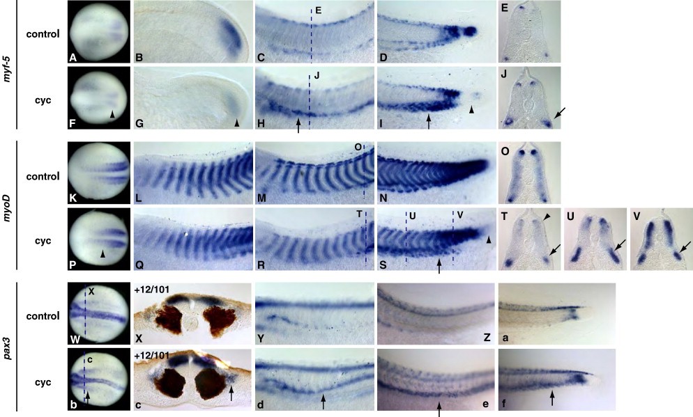 Fig. 4. Cyclopamine treatment elicits the opposite effect of shh overexpression. Stages 20, 24, 31, and 33/34 cyclopamine-treated embryos were compared to control embryos for myf-5, myoD, and pax3 expression. At stage 20, myf-5 (A, F) and myoD (K, P) expression are reduced in cyclopamine-treated embryos (F, P, arrowheads), while pax3 (W, X, b, c) is upregulated (b, c, arrows). This is especially evident in transverse sections, where pax3 expression is stronger along the lateral surface of the differentiated myotome in cyclopamine-treated embryos (c, arrow) than in controls (X). At stage 24, myf-5 (B, G) is significantly reduced in the posterior of a cyclopamine-treated embryo (G, arrowhead) when compared to a control (B). At this stage, myoD (L, Q) is reduced in the anteriorâposterior extent of expression in anterior somites in cyclopamine-treated embryos (Q). Also at stage 24, pax3 expression (Y, d) is strongly upregulated in the ventral region of somites in cyclopamine-treated embryos (e, arrow). By stage 31, myf-5 expression (CâE, HâJ) is strongly upregulated in the ventral domain of somites in cyclopamine-treated embryos (HâJ, arrows), while initial expression in forming somites is still lost (I, arrowhead). The expression of myoD is similarly upregulated in the ventral region of somites in cyclopamine-treated embryos (RâV, arrows), particularly in posterior somites (S, arrow), and lost in the newly formed somites of the tailbud (S, arrowhead). At stage 33/34, the expression of pax3 (Zâa, eâf) remains upregulated in the ventral regions of somites in cyclopamine-treated embryos, in both the anterior (e compared to Z, arrow) and posterior (f compared to a, arrow).