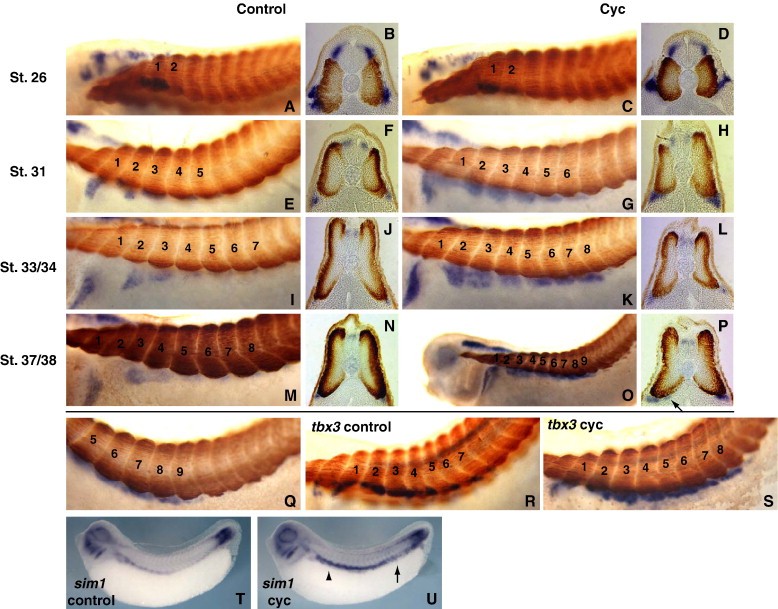 Fig. 5. Cyclopamine treatment expands hypaxial specific markers medially and posteriorly. The expressions of lbx1 (AâQ), tbx3 (R, S), and sim1 (T, U) were examined in control (A, B, E, F, I, J, M, N, R, T) and cyclopamine-treated (C, D, G, H, K, L, O, P, Q, S, U) embryos. Trunk somites in lbx1- and tbx3-probed embryos are labeled with numbers, with the most anterior trunk somite labeled 1. At stage 26 there are no significant differences in lbx1 expression between control (A, B) and cyclopamine-treated embryos (C, D). At stages 31 (EâH), 33/34 (IâL), and 37/38 (MâQ), lbx1 expression is expanded one somite posterior compared to controls, and is expanded medially towards the notochord (P, arrow, compare to N). The image in panel Q is a higher power image of the embryo in panel O. The expression of tbx3 is also expanded one somite posteriorly in cyclopamine-treated embryos (S compared to R). The expansion of the hypaxial dermomyotome marker sim1 is also observed in stage 32 cyclopamine-treated embryos (U) in both the anterior somites where it is normally expressed (arrowhead) and in the posterior somites (arrow), as compared to a control embryo (T).