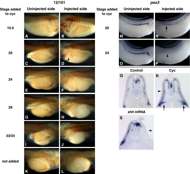 Fig. 7. Dermomyotome and hypaxial muscles cannot be rescued after premature differentiation of myoblasts. Embryos were injected in one cell at the 2-cell stage with shh mRNA and subsequently added to cyclopamine at stages 10.5 (A, B), 20 (C, D, M, N), 24 (E, F, O, P), 28 (G, H), 33/34 (I, J), never added to cyclopamine (K, L, S), added to cyclopamine but not injected with shh (R), or not treated (Q). Embryos were fixed at stage 42 (AâL), 31 (MâP), and 33/34 (QâS). Embryos fixed at stage 42 were examined with the 12/101 antibody, while the rest were probed for pax3 expression. When injected embryos are added to cyclopamine at stage 10.5, there is no difference in hypaxial muscle between the injected and uninjected side (B compared to A). When added at stage 20, hypaxial muscles are normal except for in the most anterior, where they are missing (D, arrowhead). When added to cyclopamine at stage 24 and beyond, or not added at all, hypaxial muscles are missing on the injected side (F compared to E, H to G, J to I, L to K). When injected embryos are added to cyclopamine at stage 20 and fixed at stage 31, there is some recovery of pax3 expression on the injected side (N compared to M, arrow), while those added at stage 24 do not exhibit any pax3 recovery (P compared to O, arrowhead). A transverse section through a stage 33/34 embryo that has only been treated with cyclopamine and stained for pax3 expression (R), exhibits a medial expansion of pax3 at the ventral edge of the somite (arrow) and an increase in pax3 expression along the lateral edge of the somite (arrowhead) as compared to a control embryo (Q). A transverse section of a stage 33/34 embryo that has been injected with shh mRNA in one cell at the 2-cell stage shows a complete loss of pax3 expression in the somite on the injected side (S, arrowhead).