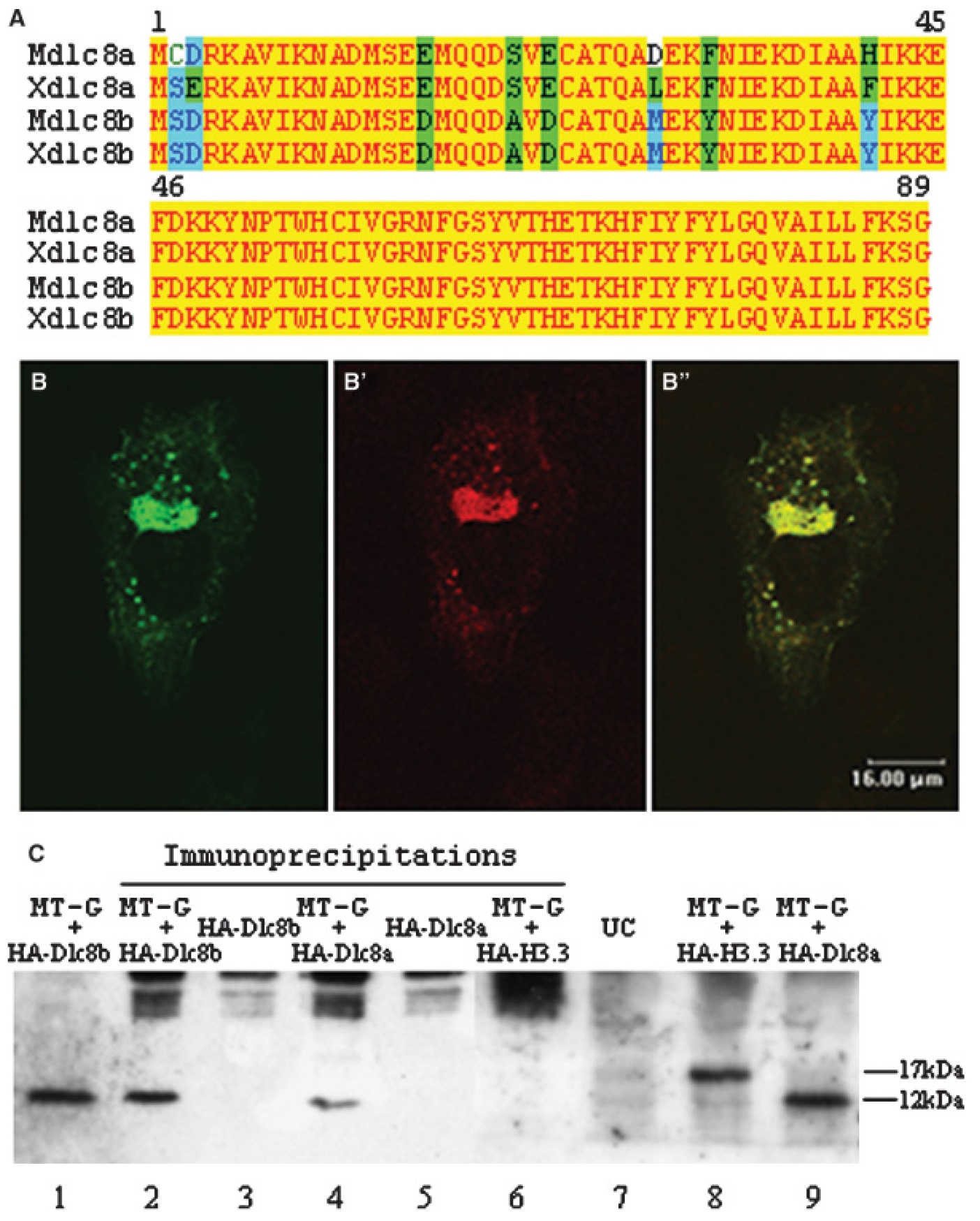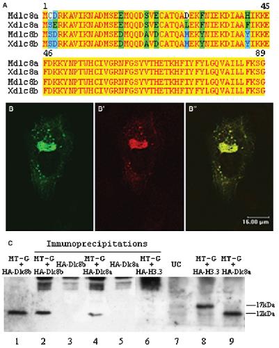 chains dlc8a and dlc8b. (A) Alignment of murine dlc8a and dlc8b
