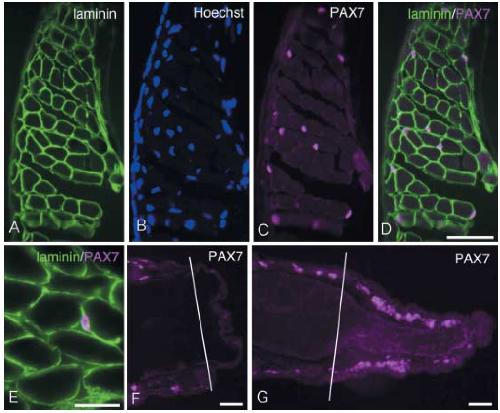 G) and 25 μm in (E). A stage 48 tadpole was fixed in 4% paraformaldehyde, infiltrated in 18% sucrose, embedded in Tissue-Tek OCT compound (Sakura) and frozen in n-hexane cooled with liquid nitrogen. A cryosection was re-fixed in 4% paraformaldehyde and treated with a mixture of antibodies, containing a monoclonal anti-PAX7 antibody (DSHB, Iowa; Kawakami et al. 1997) and a rabbit anti-laminin antibody (Sigma). The signals were detected with Cy3- and Alexa488-conjugated secondary antibodies (molecular probes).