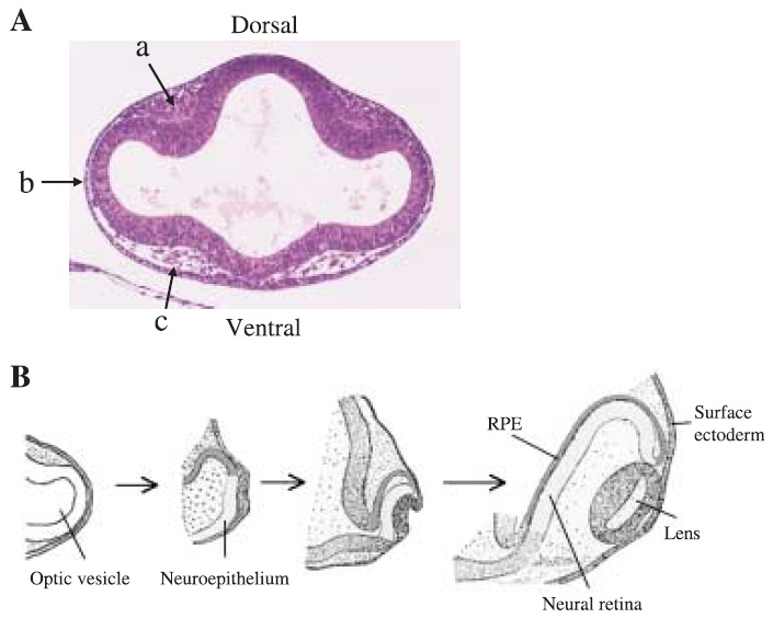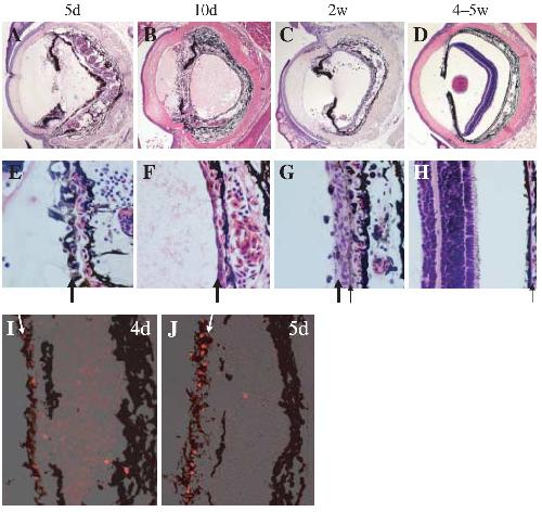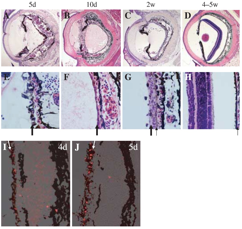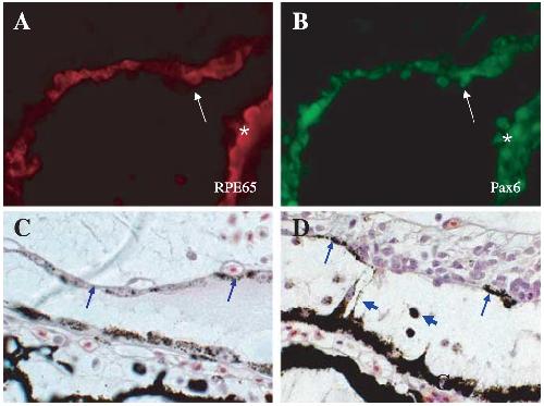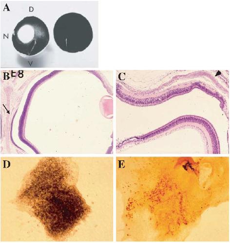 8-day embryonic homozygote eye. The region indicated by an arrow shows a thickening of RPEepithelium and has already
