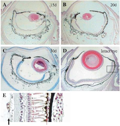 transdifferentiated to the retinal fate. (C) In a 13-day embryo, transdifferentiated neural retina shows well-organized cell layers with a