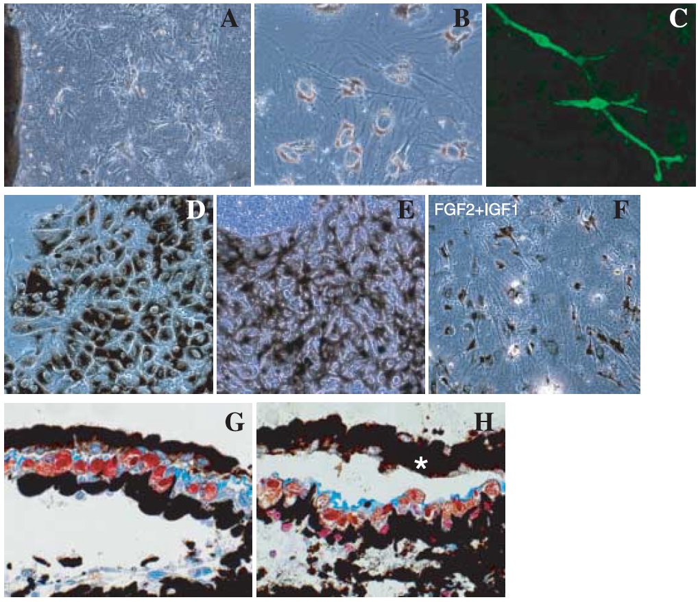 (FGF)2 (E). In (D) the epithelial sheet remains densely pigmented and does not transdifferentiate. In the presence of FGF2 (E), RPE
