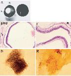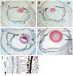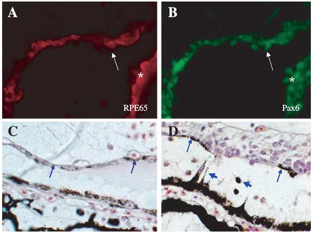 Fig. 8. Transdifferentiation of retinal pigmented epithelium (RPE) into the retinal tissue in Silver quail homozygote. (A) Eye cups of