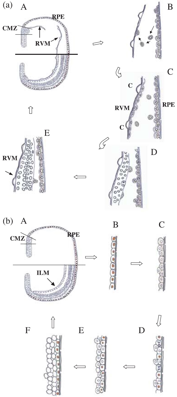 epithelium (RPE) cells leave the RPE layer, migrate and attach
