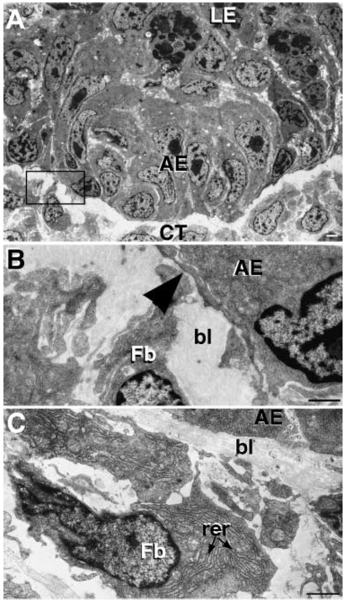 basal lamina (bl), which becomes thick and amorphous. (C)