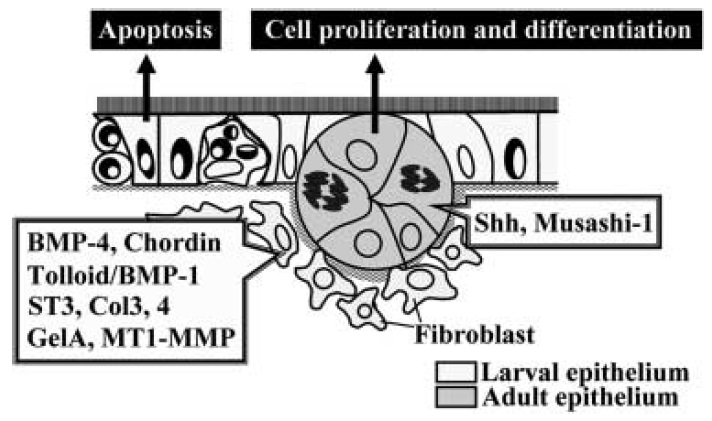 without BMP-4 and Chordin. Primordia (arrowheads) of the adult epithelium (AE) become detectable between the larval epithelium