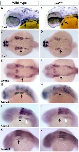 Figure 2. The mosm188 mutation affects migratory cranial neural crest. A,B:dlx8 expression was analyzed by in situ hybridization at 36 hpf in the craniofacial primordia of wild-type (A) and mosm188 (B) embryos. In mosm188mutants, expression appears slightly reduced in the first primordium but it is faint in the second (arrow in all panels) and absent in the posterior streams. C,D: Dorsal view of dlx2 expression at 24 hpf shows markedly reduced expression in the first two neural crest streams and almost complete absence in the postotic ones. E,F: Expression of the paraxial mesoderm and headmesenchyme marker wnt5a is substantially reduced at 24 hpf in the second and posterior NC streams in the mosm188 mutants while the first arch expression appears unaffected. G,H: The expression of sox9a, a marker of cranial mesenchymal condensations, is reduced in the first arch and is completely abolished in the second and posterior arches (24 hpf). I-L: The hox gene expression in hindbrainrhombomeres (r) is comparable between wild-type (I, K) and mosm188 (J, L) embryos, but expression of hoxa2 in the hyoid neural crest stream is largely absent, (arrow, J). Expression of hoxa2 and hoxb3 in the postotic stream is considerably reduced (white arrowhead in I,L).
