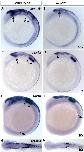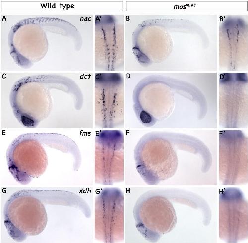 Figure 4. Pigment cell progenitors show deficits in the mosm188 mutants. Expression analysis of pigment specific genes in wild type (A, C, E, G) lateral and (A', C', E', G') dorsal views, and in mosm188 mutants (B, D, F, H) lateral and (B', D', F', H') dorsal views as revealed by whole mount in situ hybridization in 22 hpf embryos. A-B': Expression of mitfa/nac, the early marker of pigment progenitors, is significantly downregulated in the trunk region while the mid-hindbrain boundary domain is unaffected in mosm188 mutants. C-D': Similarly, the melanophores specific dct/trp2 expression is largely absent in mosm188 mutants at this stage. E-F':Fms that specifies melanophore and xanthophore lineages is essentially absent in mosm188mutants as is xanthine dehydrogenase (G-H'), the enzyme in pteridine synthesis pathway that marks lineage-committed xanthoblasts.