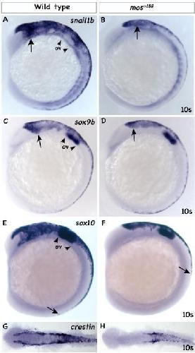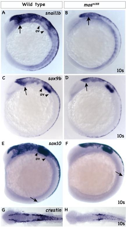 Figure 6. Expression of NC specification genes. A,B: Expression of snail1b in the premigratory NC cells (arrow) of wild-type embryos (A) is localized to the dorso-lateral edge of the neural tube, but it is greatly reduced in mosm188 mutants (B). The expression in the somites is unaltered. The arrowheads in wild-type embryos demarcate the position of the otic vesicle. C,D:Expression of sox9b is greatly reduced in NC progenitors (arrows) in mosm188 mutants (D), while the otic vesicle expression (arrowheads) is unaltered. E,F: Expression of sox10 in premigratory NC cells of wild-type embryos (E) is localized to the dorso-lateral edge of the neural tube (arrow). Sox10 expression is greatly reduced in mosm188 mutants (F), while the otic vesicle expression (arrowheads) is unaltered. G,H: The wild-type pattern (G) of crestin expression in the cranial region is absent in mosm188 mutants (H), but it is only reduced in the trunk. Lateral views in A-F and dorsal flat mounts in G and H, anterior to the left.
