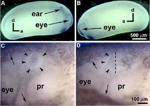 The inner ear develops from a simple ectodermal thickening known as the otic placode. Classic embryological manipulations rotating the prospective placode tissue found that the anteroposterior axis was determined before the dorsoventral axis. A small percentage of such rotations also resulted in the formation of mirror duplicated ears, or enantiomorphs. We demonstrate a different embryological manipulation in the frog Xenopus: the physical removal or ablation of either the anterior or posterior half of the placode, which results in an even higher percentage of mirror image ears. Removal of the posterior half results in mirror anterior duplications, whereas removal of the anterior half results in mirror posterior duplications. In contrast, complete extirpation results in more variable phenotypes but never mirror duplications. By the time the otocyst separates from the surface ectoderm, complete extirpation results in no regeneration. To test for a dosage response, differing amounts of the placode or otocyst were ablated. Removal of one third of the placode resulted in normal ears, whereas two-thirds ablations resulted in abnormal ears, including mirror duplications. Recent studies in zebrafish have demonstrated a role for the hedgehog (Hh) signaling pathway in anteroposterior patterning of the developing ear. We have used overexpression of Hedgehog interacting protein (Hip) to block Hh signaling and find that this strategy resulted in mirror duplications of anterior structures, consistent with the results in zebrafish.
