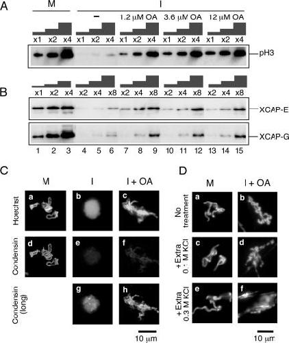 Figure 2. Stimulation of chromosomal binding of condensin I by OA in interphase extracts. (A) Sperm nuclei were incubated with mitotic extract (lanes 1–3), interphase extract (lanes 4–6), interphase extract supplemented with 1.2 (lanes 7–9), 3.6 (lanes 10–12) or 12 μM (lanes 13–15) of OA at 22°C for 2 h. Chromatin-bound proteins were dissolved with SDS-PAGE sample buffer, and 12.5 (lanes 1, 4, 7, 10 and 13), 25 (lanes 2, 5, 8, 11 and 14) and 50% (lanes 3, 6, 9, 12 and 15) of each sample were separated by SDS–PAGE, and immunoblotted with anti-phospho H3. (B) Samples were prepared as described in (A), and 6.25% (lane 1), 12.5% (lanes 2, 4, 7, 10 and 13), 25% (lanes 3, 5, 8, 11 and 14) and 50% (lanes 6, 9, 12 and 15) of samples were blotted using anti-XCAP-E (upper), and anti-XCAP-G (lower) antibodies. (C) Sperm chromatin was assembled in the mitotic extract (a, d), interphase extract (b, e, g), and interphase extract supplemented with 3.6 μM OA (c, f, h). Samples were fixed and stained with Hoechst (a, b, c; first low), and anti-XCAP-H antibody (d, e, f; second low, short exposure: g, h; third low, long exposure). Bar, 10 μm. (D) Sperm chromatin was assembled in the mitotic extract (a, c, e) or interphase extract supplemented with 3.6 μM OA (b, d, f). After assembly, the reaction mixtures were supplemented with the indicated extra concentration of KCl at 22°C for 20 min, fixed, and stained with Hoechst. Bar, 10 μm.