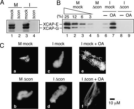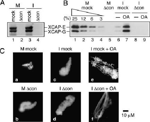 Figure 3. Requirement of condensin in OA-dependent partial chromosome condensation in the interphase extract. (A) Mitotic (lanes 1–2) and interphase (lanes 3–4) extracts were mock-depleted (lanes 1 and 3) or depleted with a mixture of affinity-purified condensin antibodies (lanes 2 and 4). Equal volumes of these extracts were subjected to SDS-PAGE, blotted, and detected using the indicated antibodies. (B) Sperm chromatin was incubated with mock-depleted mitotic extract (lanes 1–4), condensin-depleted mitotic extract (lane 5), mock-depleted interphase extract (lane 6), mock-depleted interphase extract supplemented with OA (lane 7), condensin-depleted interphase extract (lane 8) or condensin-depleted interphase extract supplemented with OA (lane 9) at 22°C for 2 h. The assembled structures were isolated, and 25 (lane 1), 12.5 (lane 2), 6.3 (lane 3), 3.1 (lane 4) and 100% (lanes 5–9) were analyzed by immunoblotting with the indicated antibodies. (C) Sperm chromatin was incubated with mitotic extract (a), condensin-depleted mitotic extract (b), mock-depleted interphase extract (c), mock-depleted interphase extract with OA (d), condensin-depleted interphase extract (e), or condensin-depleted interphase extract with OA (f) at 22°C for 2 h. After incubation, assembled chromatin structures were fixed and stained with Hoechst. Bar, 10 μm.
