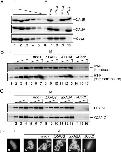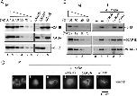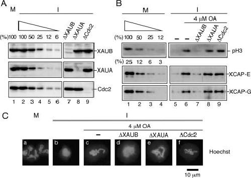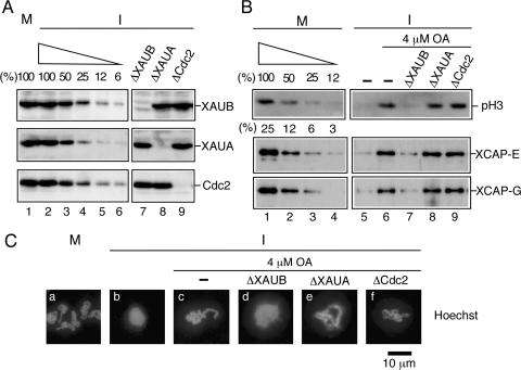 Figure 4. Requirement of Aurora B in the Cdc2-independent chromosomal targeting of condensin I. (A) Interphase extract was depleted with anti-Aurora B (lane 7), anti-Aurora A (lane 8) or anti-Cdc2 antibodies (lane 9). As a standard, 100% (lane 1) of mitotic extract, 100% (lane 2), 50% (lane 3), 25% (lane 4), 12.5% (lane 5) and 6.25% (lane 6) of interphase extract were loaded in parallel. Efficiency of immunodepletion was measured by quantitative immunoblotting using the antibodies indicated. (B) Sperm nuclei were incubated with mitotic extract (lanes 1–4), or interphase extract (lane 5), OA-treated interphase extract (lane 6), OA-treated interphase extract depleted of Aurora B (lane 7), OA-treated interphase extract depleted of Aurora A (lane 8), and OA-treated interphase extract depleted of Cdc2 (lane 9). Chromatin or chromosomes were isolated, and 100% (lanes 1, 5–9), 50% (lane 2), 25% (lane 3) and 12.5% (lane 4) of the samples were blotted by anti-phospho-H3 antibody (upper), anti-XCAP-C (middle) or anti-XCAP-E (lower) antibodies. In the case of blotting with anti-condensin subunit antibodies, a lower amount of samples was used as a standard, namely, 25% (lane 1), 12.5% (lane 2), 6.3% (lane 3) and 3.1% (lane 4). (C) Sperm chromatin was incubated with mitotic extract (a), interphase extract (b), OA-treated interphase extract (c), OA-treated interphase extract depleted of Aurora B (d), OA-treated interphase extract depleted of Aurora A (e) and OA-treated interphase extract depleted of Cdc2 (f). Samples were fixed and stained with Hoechst.