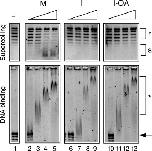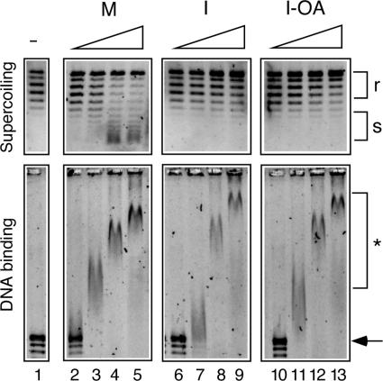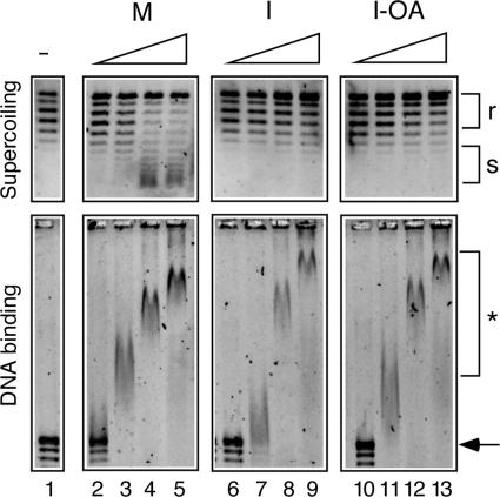 Figure 5. Effect of OA on the supercoiling activity of condensin I. Condensin I was affinity-purified from mitotic (lanes 2–5), interphase (lanes 6–9), or OA-treated interphase extract (lanes 10–13) and standard supercoiling (upper) and DNA binding assays (lower) were performed; r, relaxed circular DNA; s, positively supercoiled DNA; arrow, free DNA; asterisk, DNA bound to condensin I. The approximate molar ratios of condensin I to DNA were 15:1 (lanes 2, 6 and 10), 30:1 (lanes 3, 7 and 11), 60:1 (lanes 4, 8 and 12) and 120:1 (lanes 5, 9 and 13). Condensin I was omitted from lane 1.