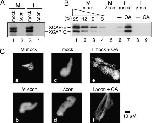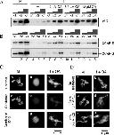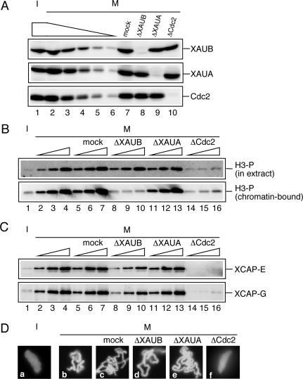 Figure 1. Effect of Aurora-B depletion on condensin I binding to chromosomes. (A) Mitotic extracts were depleted with control IgG (lane 7), anti-Aurora B (lane 8), anti-Aurora A (lane 9) and anti-Cdc2 (lane 10). Two microliter aliquots of each extract were analyzed by immunoblotting with the indicated antibodies. To estimate the efficiency of depletion, 2 μl (lane 1) of interphase extract, 2 μl (lane 2), 1 μl (lane 3), 0.5 μl (lane 4), 0.25 μl (lane 5) and 0.12 μl (lane 6) of mitotic extract were loaded in parallel (lanes 7–10). (B) Sperm nuclei were incubated with interphase extract (lane 1), mitotic extract (lanes 2–4), mock-depleted mitotic extract (lanes 5–7), Aurora B-depleted mitotic extract (lanes 8–10), Aurora A-depleted mitotic extract (lanes 11–13), or Cdc2-depleted mitotic extract (lanes 14–16). Assembled chromatin and chromosomes were isolated through a sucrose cushion, and 12.5% (lanes 2, 5, 8, 11 and 14), 25% (lanes 3, 6, 9, 12 and 15) and 50% (lanes 1, 4, 7, 10, 13 and 16) were separated by SDS-PAGE, and then detected by immunoblotting using anti-phospho H3 antibody (chromatin-bound; lower). To test the phosphorylation level in the extracts, 1 μl (lanes 2, 5, 8, 11 and 14), 2 μl (lanes 3, 6, 9, 12 and 15) and 4 μl (lanes 1, 4, 7, 10, 13 and 16) of the extracts were immunoblotted with anti-phospho H3 antibody (in extract; upper). (C) Chromatin-bound proteins were prepared the same as (B), and were separated by SDS-PAGE and immunoblotted by anti-XCAP-E (upper) or anti-XCAP-G antibodies (lower). (D) Sperm chromatin was incubated in interphase (a), mitotic (b), mock-depleted mitotic (c), Aurora B-depleted mitotic (d), Aurora A-depleted mitotic (e) or Cdc2-depleted mitotic (f) extracts at 22°C for 2 h, fixed, and then stained with Hoechst.