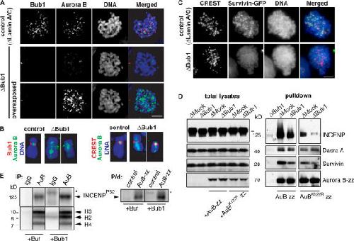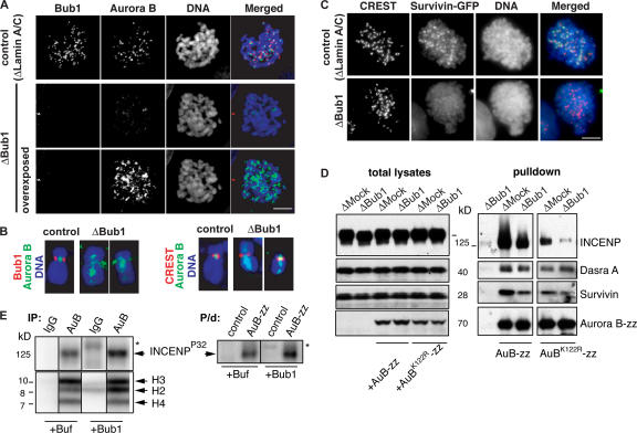 Figure 2. Bub1 is required for the inner centromeric localization of CPC in somatic cells. HeLa cells were transfected with Lamin A/C or Bub1 siRNA duplexes for 24 h and treated with nocodazole for 1 h before fixation. (A) Cells were stained to detect Bub1 (red) and Aurora B (green). (B) Individual chromosomes are shown in higher magnification to allow comparison of the Aurora B staining pattern to that of Bub1 or to the centromere marker (CREST). DNA was visualized as in Fig. 1. Note that the acquired signal of Aurora B staining in Bub1-depleted cells was overexposed. (C) HeLa cells stably expressing GFP-Survivin were treated as in A, and the position of GFP signal pattern was compared with that of CREST. (D) Bub1 is required for stability of CPC. Recombinant wtAurora B-zz or Aurora BK122R–zz were added to control or Bub1-depleted CSF extracts at a concentration approximately equal to that of endogenous Aurora B, and CPC complexes that formed on Aurora B-zz were purified by IgG–Sepharose beads. Total extracts (left) and eluates (right) were probed for the presence of CPC components. (E) Bub1 phosphorylates INCENP. CPC was either precipitated from Bub1-depleted egg extracts using antibodies against Aurora B (IP; left) or was purified on IgG–Sepharose from extracts, supplemented with Aurora B-zz (P/d, right). Mock-treated beads and beads containing precipitates were incubated with baculovirus-expressed 6His-xBub1 (50 μM) or buffer in the presence of γ[32P]ATP. Phosphate incorporation was detected using a PhosphorImager. The asterisks show the position of 6His-xBub1 (top). Immunoprecipitates (as in Fig. 1) were also incubated with core histones as exogenous substrates in the presence or absence of 6His-xBub1 to monitor Aurora B activity (bottom).