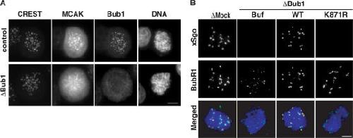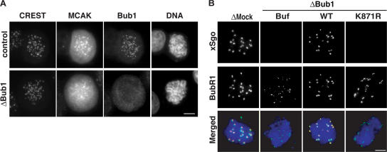 Figure 4. Bub1 controls localization of MCAK and xSgo to the ICR. (A) Cells treated as in Fig. 2 were stained with antibodies against Bub1, MCAK, and CREST. (B) Chromatin assembled as in Fig. 3 was analyzed by indirect immunofluorescence with antibodies against xSgo (red) and anti-BubR1 (green). DNA was stained as in A (blue).
