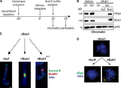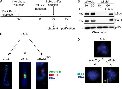 Figure 6. The assembly of the ICR is independent of mitotic chromosome formation. (A) Schematic overview of the experiment. Mock- or Bub1-depleted extracts were driven into interphase. After 60 min, mitosis was reestablished by addition of an aliquot of mock- or Bub1-depleted CSF-arrested extracts together with nocodazole. 30 min after induction of mitosis, baculovirus-expressed 6His-tagged wtBub1, Bub1K871R, or buffer were added, followed by incubation for an additional 30 min. (B) Chromatin was analyzed by Western blotting for the abundance of xSgo, Bub1, and phosphorylated histone H3 (pH3). (C and D) Purified chromatin was stained with antibody against Aurora B (C, green) and BubR1 (C, red) or xSgo (D, green). DNA was visualized as in Fig. 1 (blue). The inset in D shows a magnified image of an individual kinetochore pair stained with antibody against Bub1 (red) and xSgo (green). Bars: (C) 2 μm; (D) 20 μm.