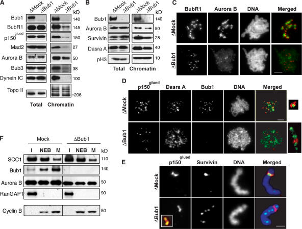Figure 1. Bub1 controls the localization of the CPC at the ICR in X. laevis egg extracts. Mock- or Bub1-depleted CSF extracts containing 1,000 sperm/μl were driven into interphase. After 60 min, mitosis was reestablished by the addition of an aliquot of corresponding CSF-arrested extracts containing nocodazole. (A and B) Samples of total extracts or purified mitotic chromatin were analyzed by Western blotting with antibodies against indicated proteins. (C and D) Chromatin assembled as in A was purified and analyzed by indirect immunofluorescence with antibodies against Aurora B and BubR1; Dasra A and p150glued and Bub1 (unmerged). DNA was visualized with Hoechst 33342 (unmerged). Insets show magnified image of individual kinetochore pairs. In the case of Bub1-depleted extracts, note that the acquired signals for Aurora B, BubR1, and Dasra A were slightly overexposed during the processing (see the text for explanation). (E) Individual chromosomes stained with antibodies against Survivin and p150glued are shown. Inset shows magnified image of the same kinetochore stained with antibodies against CENP-A (green) and p150glued (red). (F) Chromatin assembled in mock- or Bub1-depleted extracts was purified at interphase (I, 50 min after initiation), NEB (10 min after initiation of mitosis), and metaphase (M, 30 min after initiation of mitosis), and then probed for the presence of indicated proteins by Western blotting. Antibody against RanGap1 was used to detect NEB. Total lysates of egg extracts were probed with antibody against Cyclin B to estimate stability of mitosis (bottom). Bars: (C and D) 20 μm; (E) 3 μm.