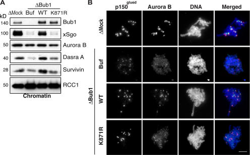 Figure 3. Bub1 kinase activity is required for ICR assembly. (A and B) Bub1-depleted extracts were supplemented either with buffer (Buf) or with in vitro–translated wild-type (WT) or kinase-dead (K871R) versions of X. laevis Bub1. (A) Mitotic chromatin assembled in these and mock-depleted extracts were analyzed for the abundance of Bub1, Sgo, and the components of the CPC by Western blotting. Antibody against RCC1 was used as a loading control. (B) Assembled chromatin was analyzed by indirect immunofluorescence with antibodies against Aurora B (green), p150glued (red), and Bub1 (blue). Bar, 20 μm.