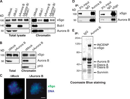 Figure 5. Soluble Bub1 is able to promote xSgo binding to the mitotic chromatin, whereas the CPC directs xSgo to the ICR. (A) Total extracts and mitotic chromatin purified from control extracts or extracts lacking Bub1, Aurora B, or both Bub1 and Aurora B, were analyzed by Western blotting with indicating antibodies. (B–E) Mock- or Aurora B-depleted extracts were treated as in Fig. 1 A and analyzed by Western blotting with the indicated antibodies (B) or by immunofluorescence with antibodies against xSgo (C; green). DNA, stained as in Fig. 1, is shown in blue. (D) Aurora B and xSgo were immunoprecipitated from CSF-arrested egg extracts by the corresponding antibodies. Immunoprecipitates were subjected to Western blotting with antibodies against Aurora B and xSgo. (E) Chromosome passenger complex precipitated with anti–Aurora B antibodies was analyzed by SDS-PAGE and CBB staining. Arrows indicate the positions of the CPC components and xSgo.