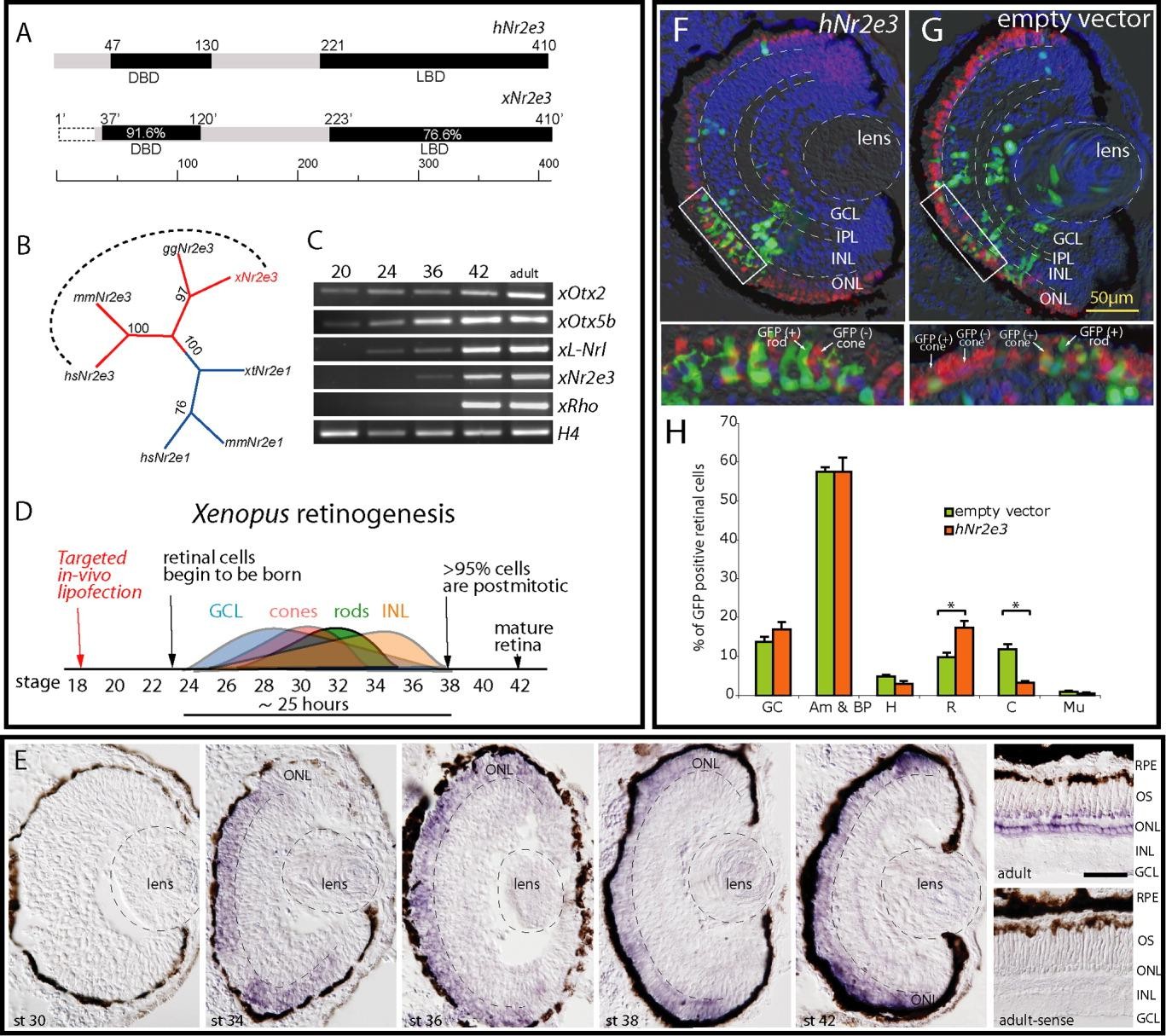 Nr2e3 and Nrl can reprogram retinal precursors to the rod fate in Xenopus retina.