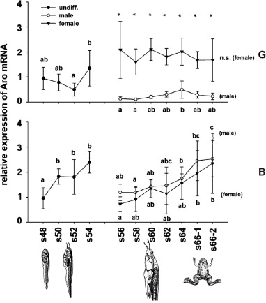 Relative mRNA expression of aromatase (Aro) mRNA in gonads with kidney (G, upper panel) and in brain (B, lower panel) of tadpoles of X. laevis during ontogeny. Values are expressed as means ± SD derived from six individuals at each developmental stage. Densitometric values were normalized by the housekeeping gene elongation factor-1α (EF-1α) for all samples. Samples were subdivided into sample sets and interconnected for the presentation of the data in a comprehensive figure. Aro mRNA expression is presented in relation to stage 48 of the gonads and of the brain, respectively, that was arbitrary set to the reference value 1. Statistical significant differences between the mRNA levels of the various stages were tested within the sample sets and between male and female tadpoles using one-way ANOVA followed by Dunnett-T3 or Tukey test, depending on the homogeneity of variance of the data. Significant differences between the developmental stages were indicated by different letters (p < 0.05) and between males and females by asterisks (p < 0.05).