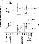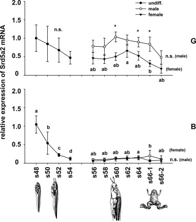 Relative mRNA expression of steroid-5α-reductase type 2 (Srd5a2) mRNA in gonads with kidney (G, upper panel) and in brain (B, lower panel) of tadpoles of X. laevis during ontogeny corresponding to Fig. 4. Values are expressed as means ± SD derived from six individuals at each developmental stage. Significant differences between the developmental stages were indicated by different letters (p < 0.05) and between males and females by asterisks (p < 0.05).