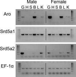 Qualitative expression of aromatase (Aro), steroid-5-alpha-reductase type 1 (Srd5a1), type 2 (Srd5a2) and elongation factor-1α (EF) mRNA in different tissues of male and female tadpoles of X. laevis are shown on an agarose gel. Expression of mRNA was analyzed at developmental stage 59 according to Nieuwkoop and Faber (1994) in gonads (G), heart (H), spleen (S), brain (B), liver (L) and kidney (K). Samples were over-amplified and cycle numbers for PCR reactions were 36 for Aro, Srd5a1 and Srd5a2, and 20 for EF. Determinations of Aro, Srd5a1, Srd5a2 and EF demonstrate specific product lengths of 274, 308, 146 and 285 bp, respectively. The molecular weight marker indicates distances of 100 bp DNA.