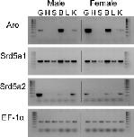 The key enzymes involved in the production of endogenous sex steroids are steroid-5-alpha-reductase and aromatase converting testosterone (T) into dihydrotestosterone (DHT) and into estradiol (E2), respectively. To gain more insights into the molecular mechanisms of sexual differentiation of amphibians, we determined the mRNA expression of steroid-5-alpha-reductase type1 (Srd5a1), type2 (Srd5a2) and aromatase (Aro) during ontogeny starting from the egg and ending after completion of metamorphosis in Xenopus laevis. Expression of all three enzymes was measured by means of semi-quantitative RT-PCR, determining for the first time Srd5a1 and Srd5a2 mRNA expression in amphibians. mRNA was analyzed in whole body homogenates from stage 12 to 48, while brain and gonads with kidney were studied separately from stage 48 to 66. Different ontogenetic mRNA expression patterns were observed for all genes analyzed, revealing early mRNA expression of Srd5a1 already in the egg at stage 12 whereas Srd5a2 and Aro was detected at stage 39. Sex-specific mRNA expressions of Srd5a2 and of Aro were determined in the gonads with kidney but not in brain. Srd5a2 was two-fold higher expressed in testes than in ovaries while Aro mRNA was ten-fold higher in ovaries. No gender-specific mRNA expression was observed for Srd5a1 in gonads and in brain. The ontogenetic patterns of Aro, Srd5a1 and Srd5a2 suggest that these genes are involved in sexual differentiation of gonads and brain already in early developmental stages. Especially in gonads Srd5a2 seems to be important for physiological regulation of testis development while Aro is associated with the development of ovaries.