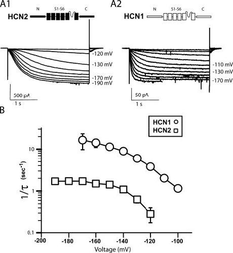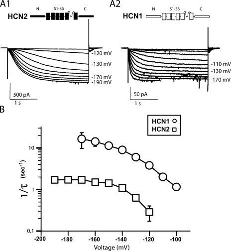Figure 2. Kinetics of HCN2 and HCN1 opening over a wide range of hyperpolarized voltages. (A1 and A2) Currents from inside-out patches obtained from oocytes injected with cRNA of HCN2 (A1) or HCN1 (A2), respectively. Currents were elicited by hyperpolarizing steps 4 s in length. Patches were stepped from a holding potential of −40 mV in 10-mV hyperpolarizing increments to test potentials ranging from −90 to −190 mV for HCN2 and from −70 to −170 mV for HCN1. Icons besides the HCN symbols represent the domain structures of HCN channels (intracellular N and C termini and the S1–S6 transmembrane domain) using solid rectangles for HCN2 and open rectangles for HCN1. (B) Relation between the rate of opening (obtained from reciprocal of the time constant of opening, τ) for HCN2 (squares) and HCN1 (circles) versus hyperpolarizing test potential. Values of 1/τ (units of 1/seconds) were measured by fitting the opening time course of HCN currents with a single exponential function following an initial delay. n = 8 for HCN1; n = 6 for HCN2. Standard error bars are shown when larger than the symbol. Note that we examined a slightly more restricted range of potentials for HCN1 than HCN2 due to the greater degree of patch instability at negative voltages from oocytes expressing HCN1.