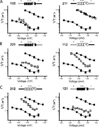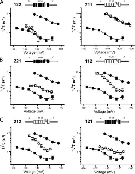 Figure 3. Role of HCN channel domains in determining the differences in opening kinetics between HCN1 and HCN2. Chimeras between wild-type HCN1 and HCN2 were made by swapping the N termini, transmembrane domains, or C termini between the two channels. Icons in each panel show approximate composition of different chimeras. Filled objects represent HCN2 sequences and open objects represent HCN1 sequences. Each graph plots mean binned values of 1/τ as a function of normalized binned test voltage (see Materials and methods) for HCN2 (squares; n = 9), HCN1 (circles; n = 7), and given chimera (open triangles). Standard error bars are shown when larger than the symbol for both the 1/τ and voltage axes (see Materials and methods). Note that HCN1 and HCN2 data in this and subsequent figures was obtained from a different series of experiments than shown in Fig. 2. (A) Chimeras in which the N terminus of HCN2 was replaced by the N terminus of HCN1 (122, left; n = 6) or in which the N terminus of HCN1 was replaced with the N terminus of HCN2 (211, right; n = 7). (B) Chimeras in which the C terminus of HCN2 was replaced by the C terminus of HCN1 (221, left; n = 8) or in which the C terminus of HCN1 was replaced with the C terminus of HCN2 (112, right; n = 8). (C) Chimeras in which the S1–S6 region of HCN2 was replaced by the corresponding region of HCN1 (212, left; n = 7) or in which the S1–S6 region of HCN1 was replaced with that of HCN2 (121, right; n = 8).