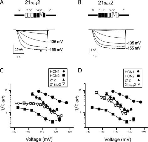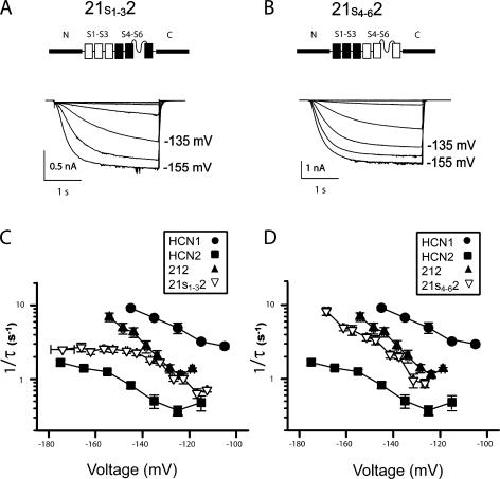 Figure 4. Effect on opening kinetics of replacing the S1–S3 or S4–S6 transmembrane subdomains of HCN2 with corresponding regions of HCN1. (A) Currents elicited by hyperpolarizing steps for chimera in which the S1–S3 region of HCN2 was replaced with the corresponding region of HCN1 (chimera 21S1-32). (B) Currents elicited by hyperpolarizing steps for chimera in which the S4–S6 region of HCN2 was replaced with the corresponding region of HCN1 (chimera 21S4-62). (C) Relation between the rate of opening (1/τ) and test potential for the chimera 21S1-32 (inverted open triangles; n = 7), chimera 212 (solid triangles, from Fig. 3 C), wild-type HCN1 (solid circles, from Fig. 3) and HCN2 (solid squares, from Fig. 3). (D) Relation between the rate of opening (1/τ) and test potential for the chimera 21S4-62 (inverted open triangles; n = 7) and other constructs as described above.