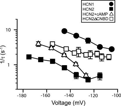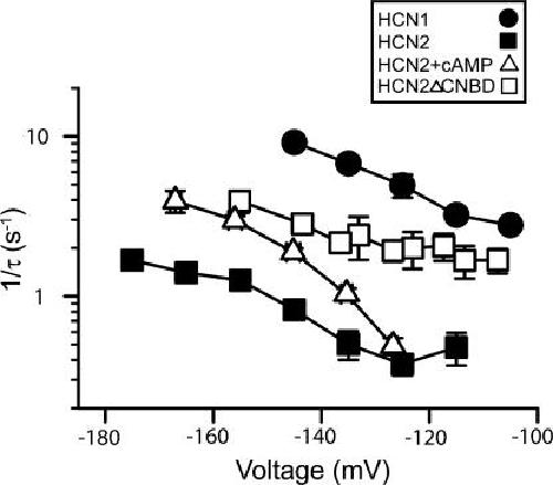 Figure 6. The effect of cAMP and deletion of the CNBD on the opening kinetics of HCN2. Rates of opening (1/τ) versus test potential for HCN2 are plotted in the absence (squares) or presence (open triangles; n = 9) of a saturating concentration of cAMP (10 μM). Data are also shown for the HCN2ΔCNBD deletion mutant, in which the CNBD and all sequence C-terminal to the CNBD have been deleted (open squares; n = 16). Data for HCN1 (filled circles) are shown for comparison.