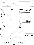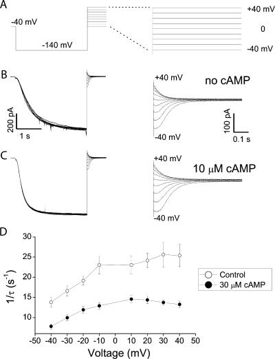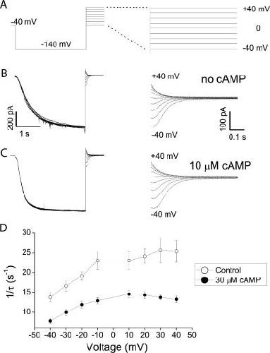 Figure 7. Effect of voltage and cAMP on HCN2tail current kinetics. (A) Illustration of voltage pulse protocol. Membrane was held at â40 mV, stepped to â140 mV for 3 s, and then stepped to a series of more positive potentials to measure tail currents. Left, entire time course of protocol. Right, protocol on an expanded time scale during tail current measurements. Time scales are shown in B. (B) HCN2 currents in absence of cAMP, at either a slow time scale showing the entire time course during opening and closing protocols (left) or an expanded time scale illustrating tail currents (right). (C) Currents obtained in presence of 10 μM cAMP at a slow (left) and expanded (right) time scale. (D) Plot of 1/Ï for tail current decay (obtained from single exponential fits) as a function of voltage during tail current measurements, either in absence (open circles) or presence (filled circles) of cAMP. Bars show SE (n = 4).