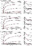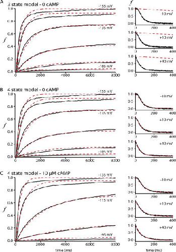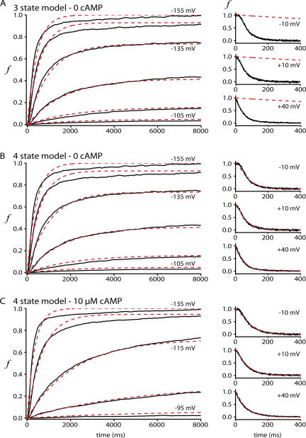 Figure 8. Fits of three-state and four-state gating schemes to HCN2 opening and closing kinetics. (A) Fits of the three-state scheme to normalized HCN2 currents in absence of cAMP. Left, HCN2 currents were measured in response to hyperpolarizing steps (10 s) from a holding potential of −40 mV to a series of test voltages in 10-mV increments (selected voltages indicated next to traces). Currents were converted to normalized open probabilities, f(t), shown as solid black traces (see Materials and methods). Dashed red traces show best fit of three-state model to data. Only the first 8 s of each trace are shown. Right, HCN2 tail currents obtained at different depolarized potentials (shown next to traces) following steps to −140 mV to open the channels. Tail currents were converted to normalized open probabilities (solid black traces). Predictions of three-state model shown as dashed red traces. Best-fit parameters with their lower and upper limits (see Materials and methods) were as follows: α0 = 3.2 × 10−6, range from 1.2 × 10−7 to 8.0 × 10−5 ms−1; sα = 9.1, range from 8.0 to 11.6 mV; β0 = 415.8, range from 18 to 7,500 ms−1, sβ = 49.0, range is greater than 10.8 mV; g = 0.0024, range from 0.0016 to 0.004 ms−1, h = 3.8 × 10−4, range from 2.7 to 5.7 × 10−4 ms−1. See text for definition of parameters and Materials and methods for normalization procedure. The mean summed square error during fits is 0.0032 for current opening data and 5.0 for tail current data. (B) Fits of the four-state scheme to normalized HCN2 currents in absence of cAMP. Data and traces as in A. Best-fit parameters for the scheme are given in Table I. Note that the model provides a reasonable fit to both opening (left) and closing (right) kinetics. (C) Fits of four-state scheme to normalized HCN2 currents obtained in presence of 10 μM cAMP. The model again provides a reasonable description of both opening and closing kinetics. Because of the cyclic nature of the scheme, the rate constant α′ (V) in fits of four-state schemes in B and C was calculated from the other rate constants to conform to microscopic reversibility.