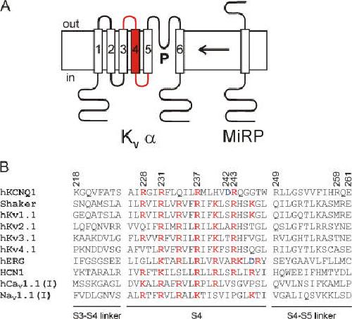 Figure 1. KCNQ1 topology and voltage sensor sequence. (A) The 6 transmembrane (TM) domain topology of Kv α subunits (left) and the 1 TM domain topology of KCNE—encoded ancillary subunits (MiRPs) (right). The S3–S4 linker, S4 domain, and S4–S5 linker are highlighted in red. (B) Sequence alignment for S3–S4 linker, S4, and S4–S5 linker in human Kv, HCN, Cav, and Nav channels. S4 residues are colored: red, positive charges; blue, negative charges. The positions of KCNQ1 charged residues mutated to alanine in this study are indicated at the top.