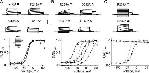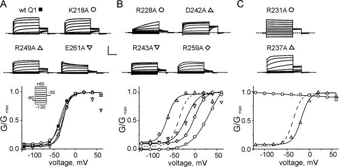 Figure 2. Effects of S4 alanine scanning mutagenesis on homomeric KCNQ1 channel activation. (A–C) Top, exemplar current traces recorded in oocytes expressing wild-type (wt) or alanine mutant KCNQ1 (Q1) channels as indicated, grouped according to their effects on V1/2 of activation (see text for details). Currents were recorded by TEVC using the standard voltage family protocol (inset, A). Bars: vertical, 1 μA (wt Q1, K218A, R259A, R231A), 0.5 μA (R249A, E261A, R228A, D242A, R243A,), 2 μA (R237A); horizontal, 1 s. Zero current level indicated by dashed line. Bottom, normalized G/V relationships obtained by measuring the tail current immediately following the prepulse; n = 9–22. In B and C dashed lines represent wt Q1 for reference. Error bars indicate SEM. Data were fitted with the Boltzmann equation (V1/2 and k values in Table I).