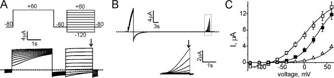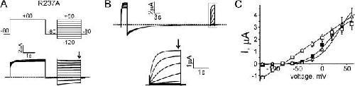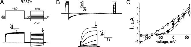 Figure 3. Homomeric R237A-KCNQ1 channels deactivate slowly. (A) Exemplar current trace recorded in oocytes injected with R237A-KCNQ1 (Q1) cRNA using a voltage protocol including a depolarizing prepulse followed by a standard voltage family (top). Zero current level indicated by dashed line. (B) Top, exemplar current trace recorded as in A but using a modified protocol with a 40-s hyperpolarizing step at −120 mV before the voltage family. Zero current level indicated by dashed line. Bottom, expanded view of boxed region from trace above. (C) Raw IV relationships measured at the time points indicated by the arrows in A and B (open squares and triangles respectively); n = 5–7. For comparison, the IV relationship for R237A currents recorded using the standard voltage protocol in Fig. 2 (without prior depolarization) is also included (filled squares). Error bars indicate SEM.