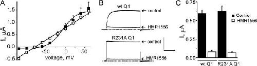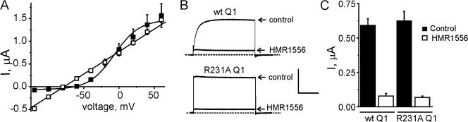 Figure 4. Properties of the R231A-KCNQ1 leak current. (A) Raw I/V relationships for wild-type KCNQ1 (Q1) (filled squares) and R231A-Q1 (open squares) obtained by measuring the peak current at the end of 3-s voltage steps, for oocytes as in Fig. 2, A and C. (B and C) Effects of Q1 pore blocker HMR1556 on R231A-Q1 current. (B) Exemplar current traces from oocytes injected as indicated and stepped to 0 mV for 3 s from a holding voltage of −80 mV before (control) and after (HMR1556) a 2-min perfusion with 10 μM HMR1556. Bars: vertical, 0.5 μA; horizontal, 1 s. Zero current level indicated by dashed lines. (C) Mean raw current measured at the end of the 3-s depolarizing pulse from traces as in B; n = 8.