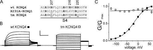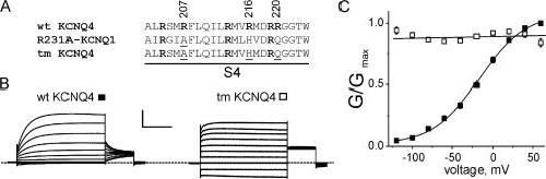Figure 5. Charge paucity in KCNQ4 S4 confers constitutive activation. (A) S4 sequence alignment for wild-type (wt) and triple mutant (tm) KCNQ4 versus R231A-KCNQ1. Positively charged amino acids are indicated in bold; mutated resides are underlined. (B) Exemplar current traces recorded in oocytes injected with wt or tm KCNQ4 mutant as indicated. Bars: vertical, 1 μA for wt KCNQ4 and 0.3 μA for tm KCNQ4; horizontal, 1 s. Zero current level indicated by dashed lines. (C) Mean G/V relationships for oocytes as in B obtained by measuring the tail current immediately following the prepulse; n = 10–13. Data for wt KCNQ4 were fitted with the Boltzman equation: V1/2 = −16.7 ± 2.2 mV, k = 28.0 ± 1.8 mV.