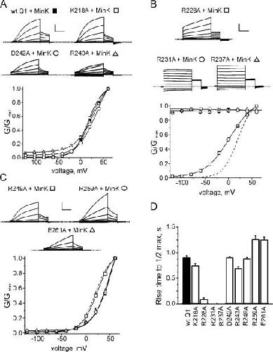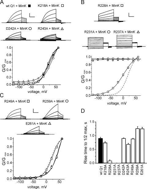 Figure 6. S4 charge balance dominates the attributes of MinK-KCNQ1 activation. (A) Top, exemplar current traces recorded in oocytes coexpressing wild-type or mutant KCNQ1 (Q1) channels as indicated and MinK. Currents were recorded by TEVC using the standard voltage family protocol (Fig. 2 A). Bars: vertical, 0.5 μA (D242A, R243A), 4 μA (wt Q1, K218A); horizontal, 1 s. Bottom, normalized G/V relationships obtained by measuring the tail current immediately following the prepulse; n = 10–13. Error bars indicate SEM. In all panels, voltage- dependent activation data were fitted with a sigmoidal relationship. (B) Top, exemplar current traces recorded in oocytes coexpressing mutant KCNQ1 (Q1) channels as indicated and MinK. Currents were recorded by TEVC using the standard voltage family protocol (Fig. 2 A). Bars: vertical, 2 μA (R231A), 4 μA (R237A), 6 μA (R228A); horizontal, 1 s. For R231A channels, a 10-fold dilution of cRNA was required to prevent excessive current density. Bottom, normalized G/V relationships obtained by measuring the tail current immediately following the prepulse; n = 6–10. Dashed line represents wt Q1 + MinK for reference. Error bars indicate SEM. (C) Top, exemplar current traces recorded in oocytes coexpressing mutant KCNQ1 (Q1) channels as indicated and MinK. Currents were recorded by TEVC using the standard voltage family protocol (Fig. 2 A). Bars: vertical, 0.5 μA (R259A, E261A), 2 μA (R249A); horizontal, 1 s. Bottom, normalized G/V relationships obtained by measuring the tail current immediately following the prepulse; n = 8–10. Dashed line represents wt Q1 + MinK for reference. Error bars indicate SEM. (D) Activation kinetics expressed as time to reach half-maximal current at +60 mV, for oocytes in A–C; n = 6–13. Error bars indicate SEM.