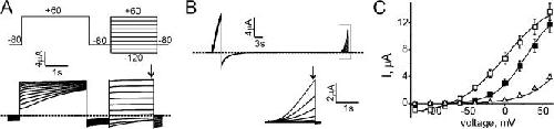 Figure 7. MinK-R228A-KCNQ1 channels deactivate slowly. (A) Exemplar current trace recorded in oocytes injected with R228A-KCNQ1 and MinK cRNA using the indicated voltage protocol (top). Zero current level indicated by dashed line. (B) Top, exemplar current trace recorded in oocytes injected with R228A-KCNQ1 and MinK cRNA using a modified version of the voltage protocol in A, with a 40-s hyperpolarizing step at −120 mV before the voltage family. Zero current level indicated by dashed line. Bottom, expanded view of boxed region from trace above. (C) Raw I/V relationships measured at the time points indicated by the arrows in A and B (open squares and triangles respectively); n = 5–6. For comparison, the I/V relationship for R228A + MinK currents recorded using the standard voltage protocol in Fig. 2 A (without prior depolarization) is also included (filled squares). Error bars indicate SEM.