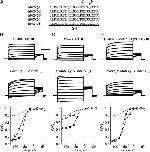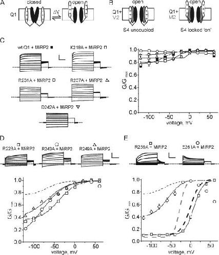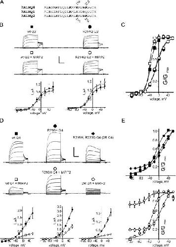 Figure 10. Charge paucity in the CO2H-terminal end of S4 endows constitutive activation upon MiRP2-KCNQ4 channels. (A) S4 sequence alignment for KCNQ1, 2, and 4. Basic amino acids are indicated in bold; KCNQ1 lacks positive charges at positions 240 and 244; these are present at equivalent positions in KCNQ2 and 4 (numbered accordingly) and were mutated to mimic the KCNQ1 S4 for experiments in B–E. (B) Top, exemplar current traces recorded in oocytes injected with wild-type (wt) or R214Q KCNQ2 (Q2) alone or with MiRP2 as indicated. Bars: vertical, 0.5 μA; horizontal, 1 s. Zero current level indicated by dashed lines. Bottom, mean I/V relationships for oocytes as above; n = 8–11. Error bars indicate SEM. (C) Mean G/V relationships for oocytes injected as in B, symbols as in B; n = 8–11. Error bars indicate SEM. Data were fitted with the Boltzmann equation; values were as follows: wild-type Q2, V1/2 = −36.2 ± 1.4 mV, k = 11.0 ± 1.0 mV, A1 = −0.01 ± 0.01, A2 = 1.0 ± 0.01; wild-type Q2 + MiRP2, V1/2 = −40.8 ± 1.4 mV, k = 8.0 ± 1.3 mV, A1 = −0.02 ± 0.01, A2 = 1.02 ± 0.01; R214Q-Q2, V1/2 = −11.1 ± 1.0 mV, k = 20.1 ± 0.9 mV, A1 = −0.06 ± 0.01, A2 = 1.02 ± 0.01; R214Q-Q2 + MiRP2, V1/2 = −12.1 ± 1.3 mV, k = 18.4 ± 1.0 mV, A1 = −0.04 ± 0.01, A2 = 1.0 ± 0.01. (D) Top, exemplar current traces recorded in oocytes injected with wild-type (wt) KCNQ4 (Q4), R216H-KCNQ4, or double mutant R216H, R220Q-KCNQ4 (2R Q4) alone (top) or with MiRP2 (bottom) as indicated. Bars: (top traces) vertical, 1 μA; horizontal, 1 s; (bottom traces) vertical, 0.5 μA; horizontal, 1 s. Zero current level indicated by dashed lines. Bottom panels, mean I/V relationships for oocytes as above; n = 8–11. Error bars indicate SEM. (E) Mean G/V relationships for oocytes injected as in D, symbols as in D; n = 8–11. Error bars indicate SEM. Data were fitted with the Boltzmann equation; values were as follows: wild-type Q4, V1/2 = −10.6 ± 1.6 mV, k = 18.3 ± 1.5 mV, A1 = 0.06 ± 0.02, A2 = 1.05 ± 0.02; wild-type Q4 + MiRP2, V1/2 = −25.9 ± 2.1 mV, k = 15.4 ± 1.8 mV, A1 = 0.03 ± 0.02, A2 = 0.99 ± 0.03; R216H-Q4, V1/2 = 33.8 ± 10.3 mV, k = 40.3 ± 4.5 mV, A1 = 0.0 ± 0.01, A2 = 1.5 ± 0.2; R216H-Q4 + MiRP2, V1/2 = −11.6 ± 4.2 mV, k = 19.0 ± 3.6 mV, A1 = 0.19 ± 0.02, A2 = 1.06 ± 0.1; 2R Q4, V1/2 = 16.1 ± 2.5 mV, k = 28.9 ± 2.0 mV, A1 = 0.15 ± 0.01, A2 = 1.19 ± 0.04; 2R Q4 + MiRP2, V1/2 = −52.1 ± 14.3 mV, k = 12.5 ± 11.9 mV, A1 = 0.73 ± 0.1, A2 = 0.98 ± 0.02.