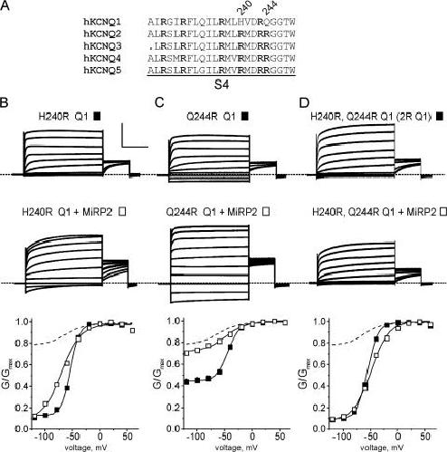 Figure 9. Charge paucity in the CO2H-terminal end of S4 is required for constitutive activation of MiRP2-KCNQ1 channels. (A) S4 sequence alignment for the KCNQ family. Positively charged amino acids are indicated in bold; KCNQ1 lacks positive charges at positions 240 and 244, which are present at equivalent positions in KCNQ2–5. (B–D) Top, exemplar current traces recorded in oocytes injected with KCNQ1 (Q1) variants: (B) H240R Q1, (C) Q244R Q1, or (D) H240R, Q244R Q1 (2R Q1) alone or with MiRP2 as indicated. Bars: vertical, 1 μA; horizontal, 1 s. Zero current level indicated by dashed lines. Bottom, mean normalized G/V relationships for oocytes injected with (B) H240R Q1, (C), Q244R Q1, or (D) H240R, Q244R Q1 (2R Q1) alone (filled squares) or with MiRP2 (open squares); n = 10–15. Dashed lines indicate G/V relationship for wild-type MiRP2-KCNQ1 channels for comparison. Error bars indicate SEM. G/V relationships when constitutive activation was <20% were fitted with the Boltzmann equation. Values were as follows: H240R Q1, V1/2 = −53.5 ± 0.5 mV, k = 8.2 ± 0.5 mV; H240R Q1 + MiRP2, V1/2 = −69.0 ± 3.4 mV, k = 17.9 ± 2.8 mV, (significant difference in V1/2 with/without MiRP2; P < 0.001). 2R Q1, V1/2 = −54.88 ± 0.49 mV, k = 9.6 ± 0.3 mV; 2R Q1 + MiRP2, V1/2 = −48.46 ± 0.6 mV, k = 16 ± 0.5 mV (significant difference in k with/without MiRP2; P < 0.001).