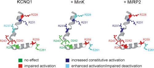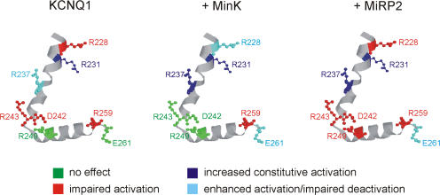 Figure 11. Summary of effects of charge perturbation in KCNQ1 S4. The KCNQ1 S4 and S4–S5 linker domains modeled on the Kv1.2 three-dimensional structure using SWISS-MODEL. The charged amino acids studied within are labeled and color coded according to their effects on the amount of constitutive current in KCNQ1 (left), MinK-KCNQ1 (center), and MiRP2-KCNQ1 (right) channels. Positions are color coded depending upon the relative activation properties of the less positively charged of the two variants tested at each position (alanine when basic residues were mutated, or the native residue when acidic residues were mutated). Thus, green indicates positions at which the less positively charged variant had no effect on activation; red indicates impaired activation; dark blue indicates increased constitutive activation; light blue indicates other enhancements of activation (left shifted voltage dependence) or slowed deactivation.