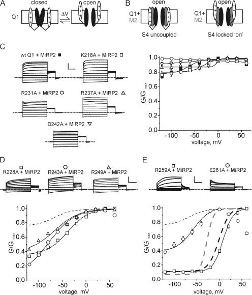 Figure 8. Net charge of S4 and the S4–S5 linker determines extent of constitutive activation of MiRP2-KCNQ1 channels. (A and B) Alternative models to explain (A) the voltage dependence of homomeric KCNQ1 channels versus (B) the voltage independence of MiRP2-KCNQ1 channels. The lipid bilayer is shown in white, with the extracellular side uppermost. (A) In homomeric KCNQ1 channels, the S4 (white with plus signs for net positive charge) is in the down (off) position and thus the gate (black) is closed (left) until depolarization shifts the S4 to the up (on) position, which opens the gate via the S4–S5 linkers (black lines) (right). (B) In MiRP2-KCNQ1 channels, MiRP2 is shown in gray. The gate is always open even at hyperpolarized voltages either because the S4 position is not communicated to the gate (left, S4 uncoupled) or because the S4 is always in the up (on) position regardless of membrane potential (right, S4 locked on). (C) Left, exemplar current traces recorded in oocytes coexpressing wild-type MiRP2 and wild-type or mutant KCNQ1 (Q1) channels as indicated. Currents were recorded by TEVC using the standard voltage family protocol (Fig. 2 A). Bars: vertical, 1 μA except 4 μA for R237A; horizontal, 1 s. Zero current level indicated by dashed lines. Right, normalized G/V relationships obtained by measuring the tail current immediately following the prepulse; n = 6–13. Error bars indicate SEM. Data were fitted with either a straight line or a sigmoidal relationship. (D) Top, exemplar current traces recorded in oocytes coexpressing wild-type MiRP2 and mutant KCNQ1 (Q1) channels as indicated. Currents were recorded by TEVC using the standard voltage family protocol (Fig. 2 A). Bars: vertical, 1 μA except 0.5 μA for R243A; horizontal, 1 s. Zero current level indicated by dashed line. Bottom, normalized G/V relationships obtained by plotting the tail current immediately following the prepulse versus prepulse voltage; n = 10–15. Error bars indicate SEM. Dashed line indicates G/V relationship for wild-type MiRP2-KCNQ1 channels for comparison. Data were fitted with a sigmoidal relationship. (E) Top, exemplar current traces recorded in oocytes coexpressing MiRP2 with either of two S4–S5 linker KCNQ1 mutants as indicated. Bars: vertical, 0.5 μA (R259A) and 0.4 μA (E261A); horizontal, 1 s. Zero current level indicated by dashed line. Bottom, normalized G/V relationships obtained by plotting the tail current immediately following the prepulse versus prepulse voltage; n = 11. For comparison, G/V relationships for oocytes injected with R259A alone (thick black dashed line), E261A alone (gray dashed line), and wt KCNQ1 + MiRP2 (thin black dashed line) are also shown. Error bars indicate SEM. A Boltzmann fit of the G/V relationship for R259A Q1 + MiRP2 gave V1/2 = −56.3 ± 3.3 mV; k = 3.6 ± 1.8 mV. Meaningful quantitative fitting of the E261A G/V relationship was prevented by some constitutive activation and subsequent inactivation.